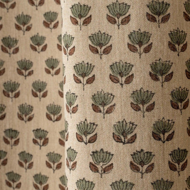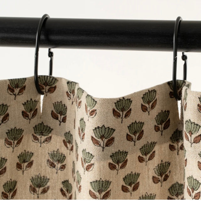Elevate your bathroom decor with the quiet beauty of the Monisha Block Print Shower Curtain. Hand block printed by skilled artisans in India, this piece features a soft, repeating floral motif in earthy green and rust tones. The fine scale of the design brings subtle pattern and warmth to your space, while the cotton-linen blend creates a relaxed drape with natural texture. A perfect choice for those who love traditional crafting methods and refined, timeless style.