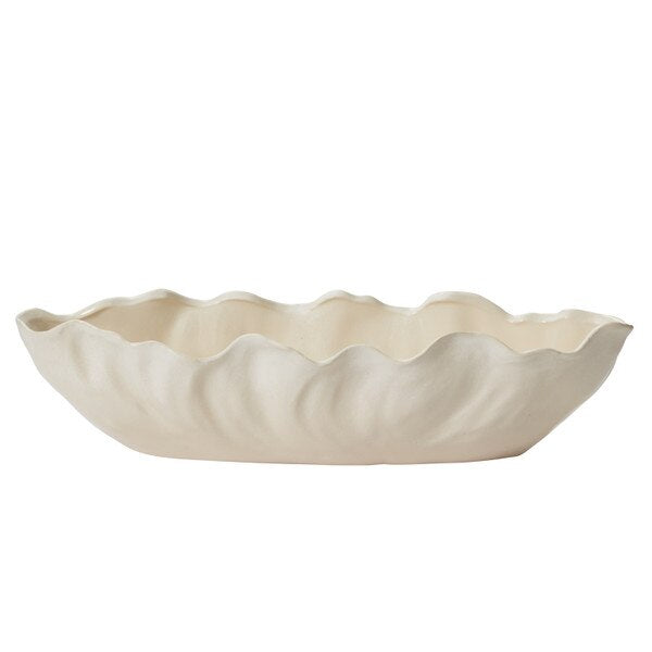 A beautiful ceramic trough shaped bowl in a creamy low lustre glaze. Beautiful for the centre of a table.
