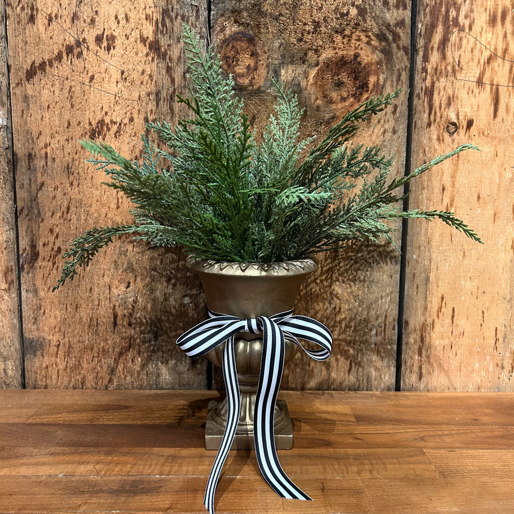 A pretty gold urn filled with our favourite faux cedar branches and striped ribbon. All ready for your table!