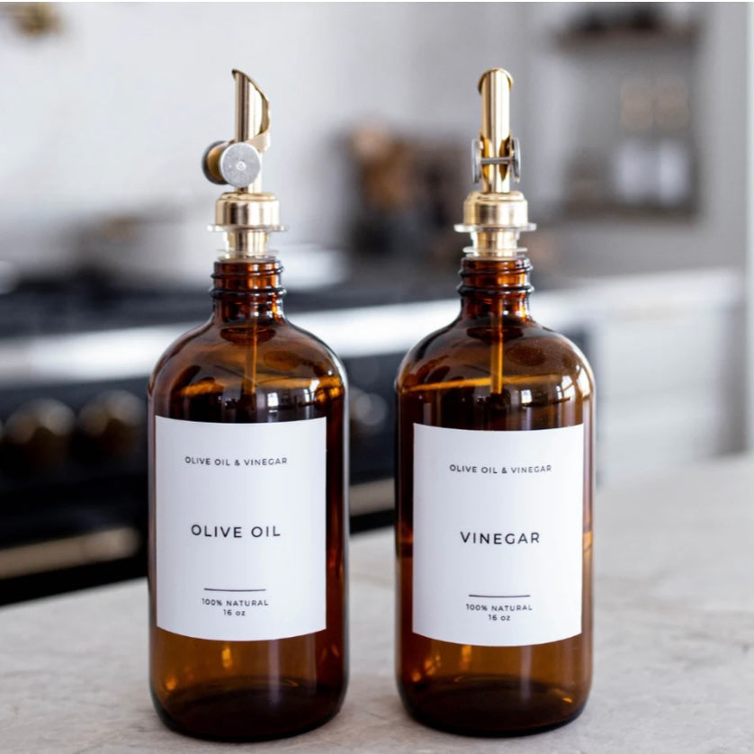 These amber glass olive oil and vinegar dispensers are a great way to elevate your kitchen. These bottles feature a sleek label and a stainless steel pour spout. The olive oil & vinegar dispensers are an easy way to add functional and stylish ways to add to your kitchen decor.
