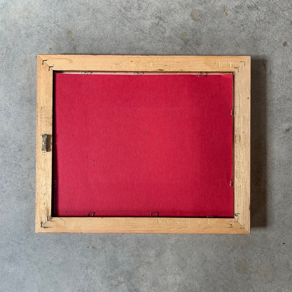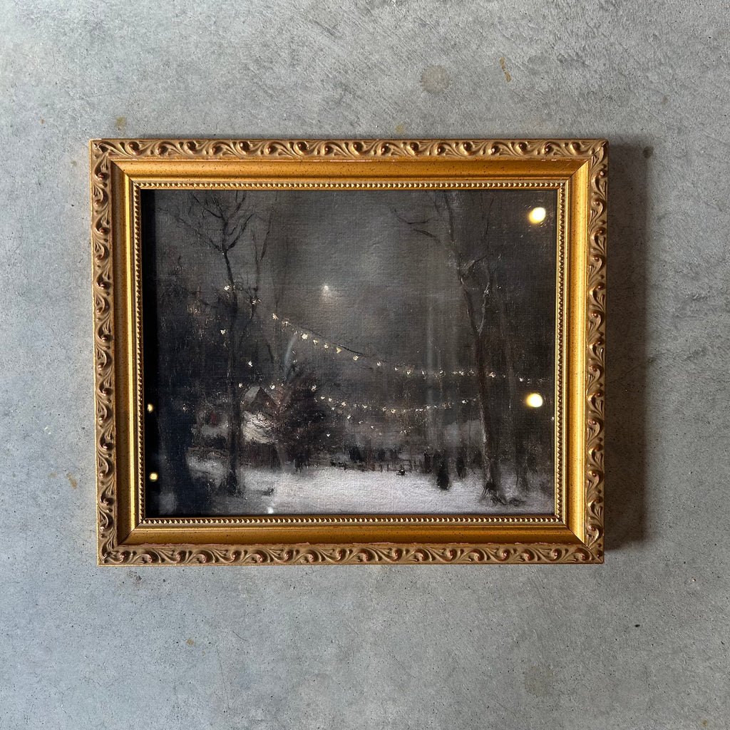 A lovely image of a wintry night printed on linen paper and housed in a gold vintage frame.