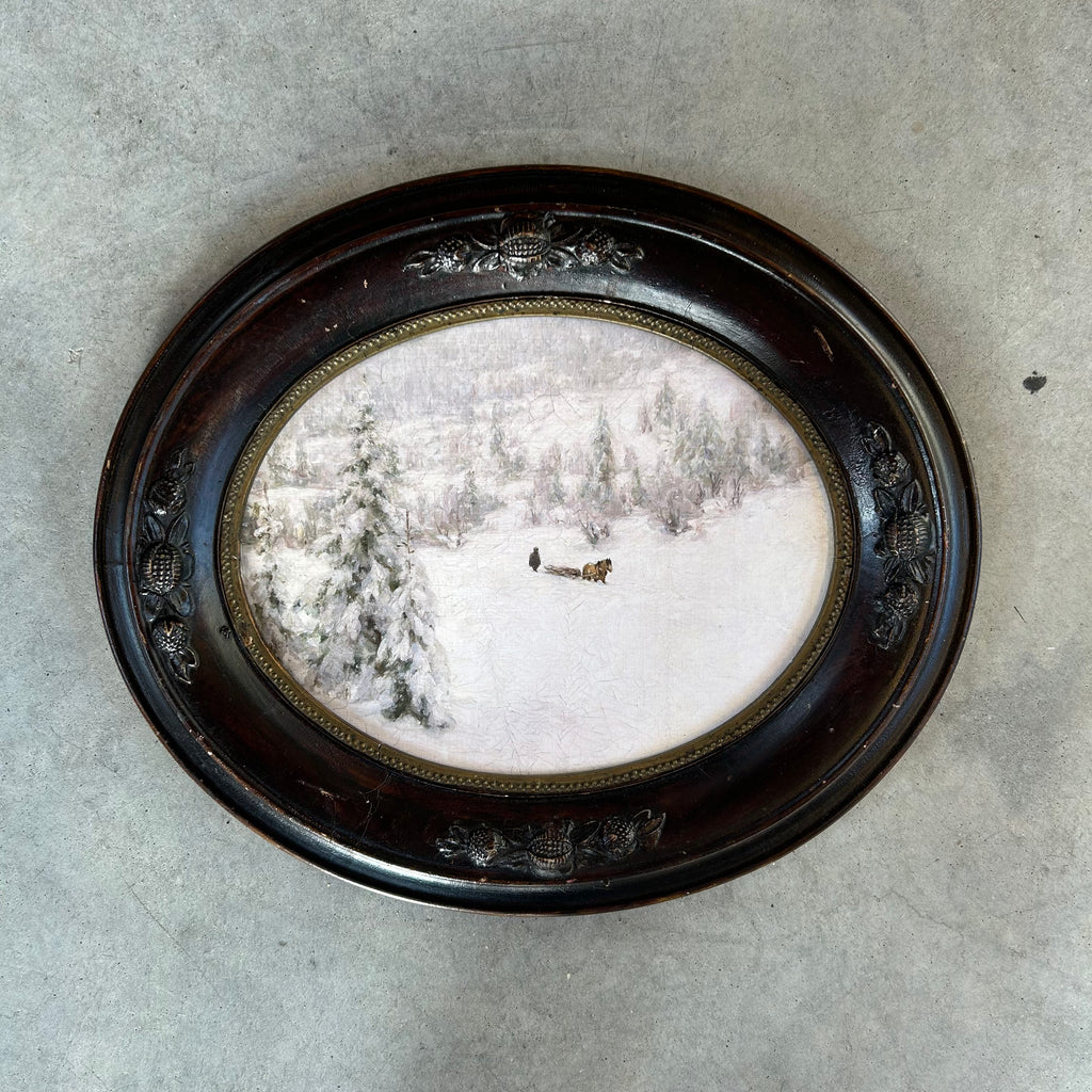 A beautiful wintry scene printed on linen paper and housed in a fantastic antique frame with museum glass.