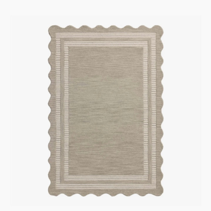 The Scottie Collection from Chris Loves Julia x Loloi is a hand-tufted wool area rug with a playful scalloped edge and lower-pile, striped border for a touch of structure. The rugs overall pile is thick and plush, available in easygoing earth tones and neutral colorways. This collection is hand-tufted of 100% wool in India and Goodweave-certified, ensuring our commitment to ethical production and the support of weavers communities. Some shedding is expected and a natural characteristic of wool rugs; we recommend vacuuming frequently without a beater bar.