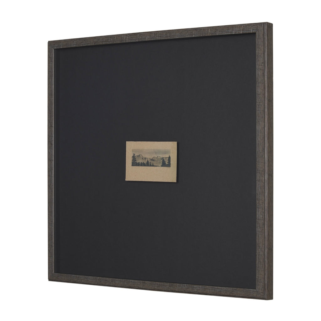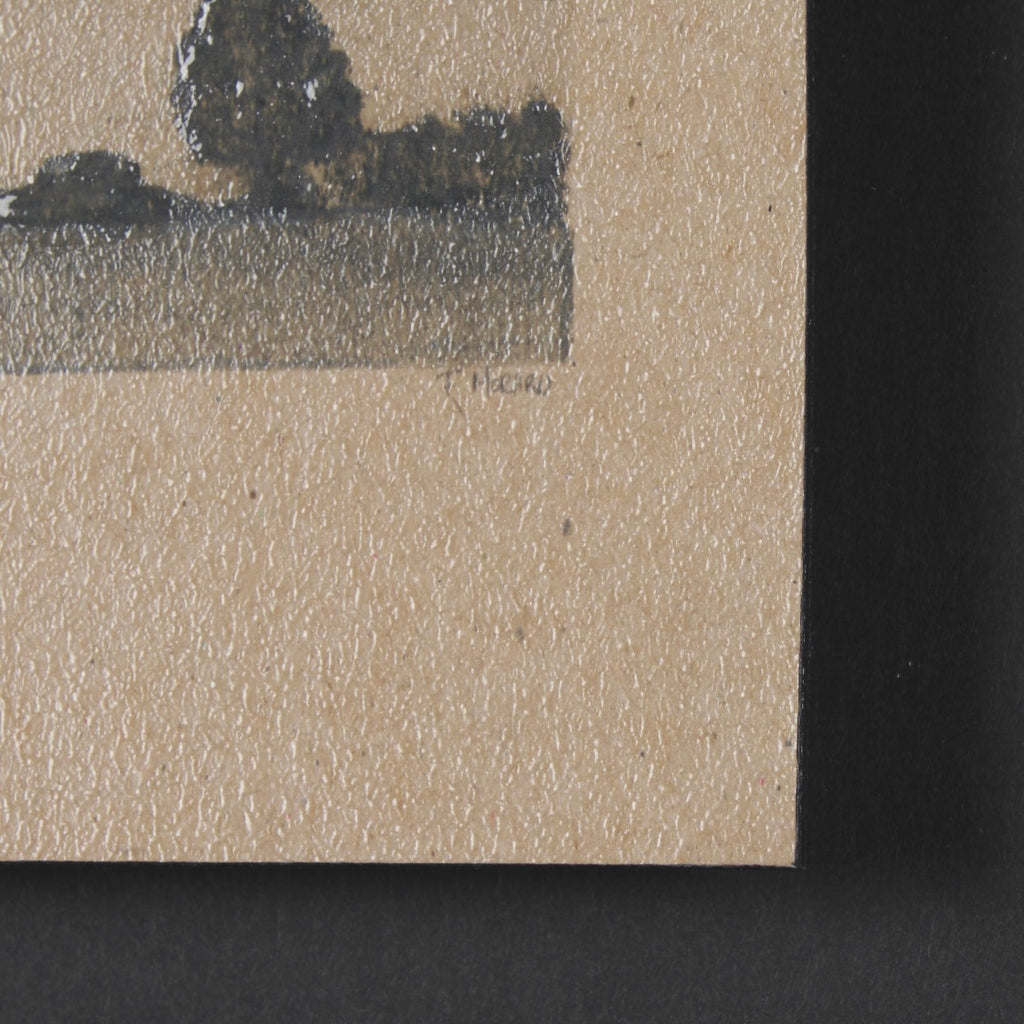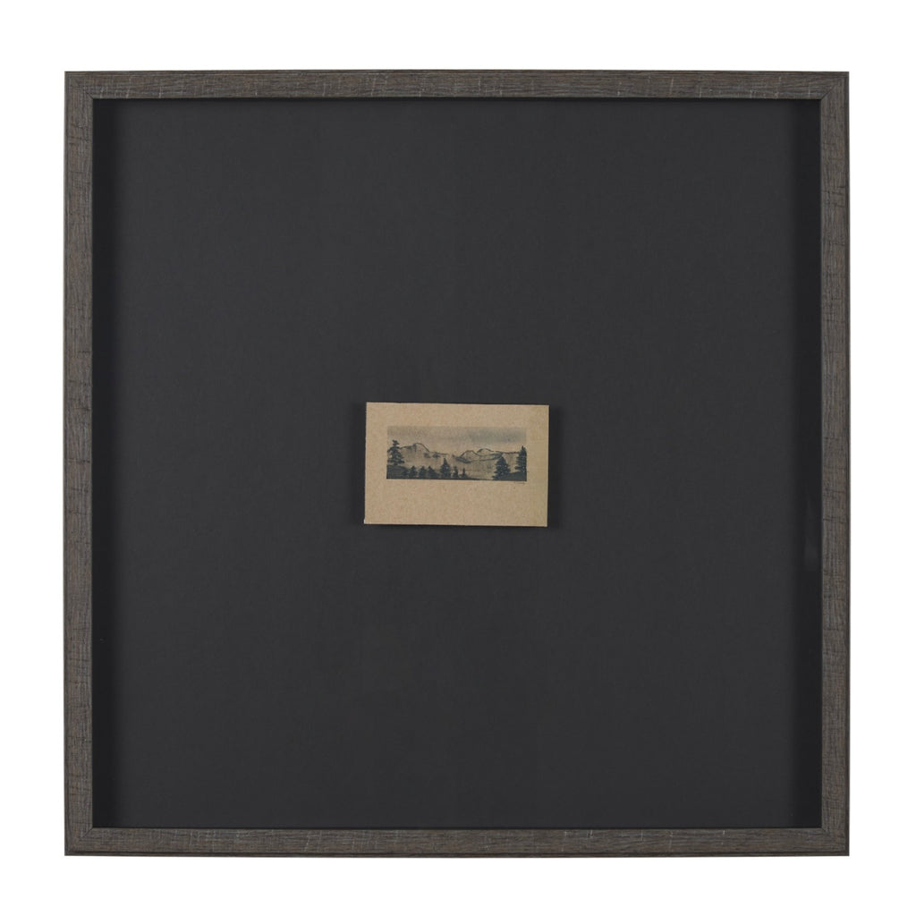 Shadows at dusk is a framed drawing print on paper, matted under glass and enriched with hand-embellished textures. A delicate sepia-toned landscape sits at the center on a small inset card, evoking a quiet moment in nature. Set against an expansive black mat, it highlights negative space and intimacy. Finished in a dark wood-look frame, this piece blends minimalism with rustic charm—ideal for modern, transitional, or gallery-style interiors.