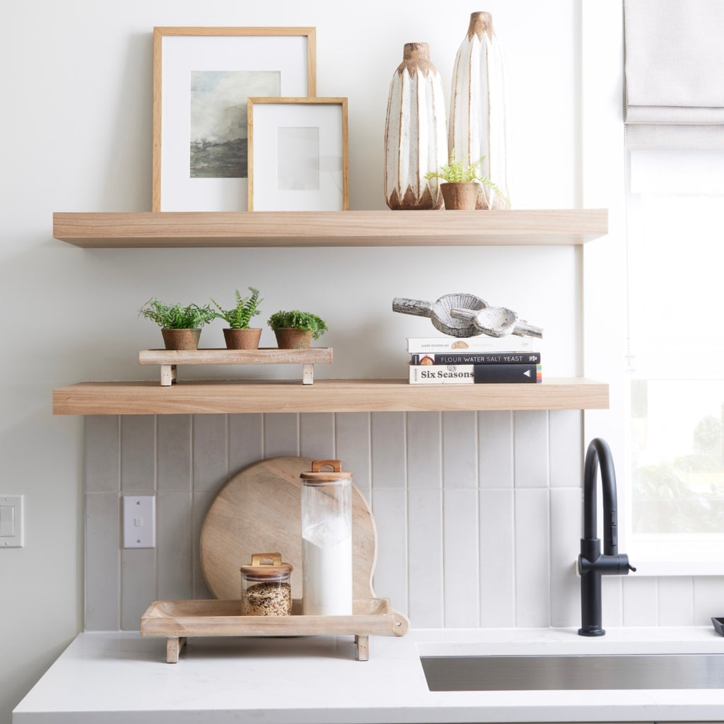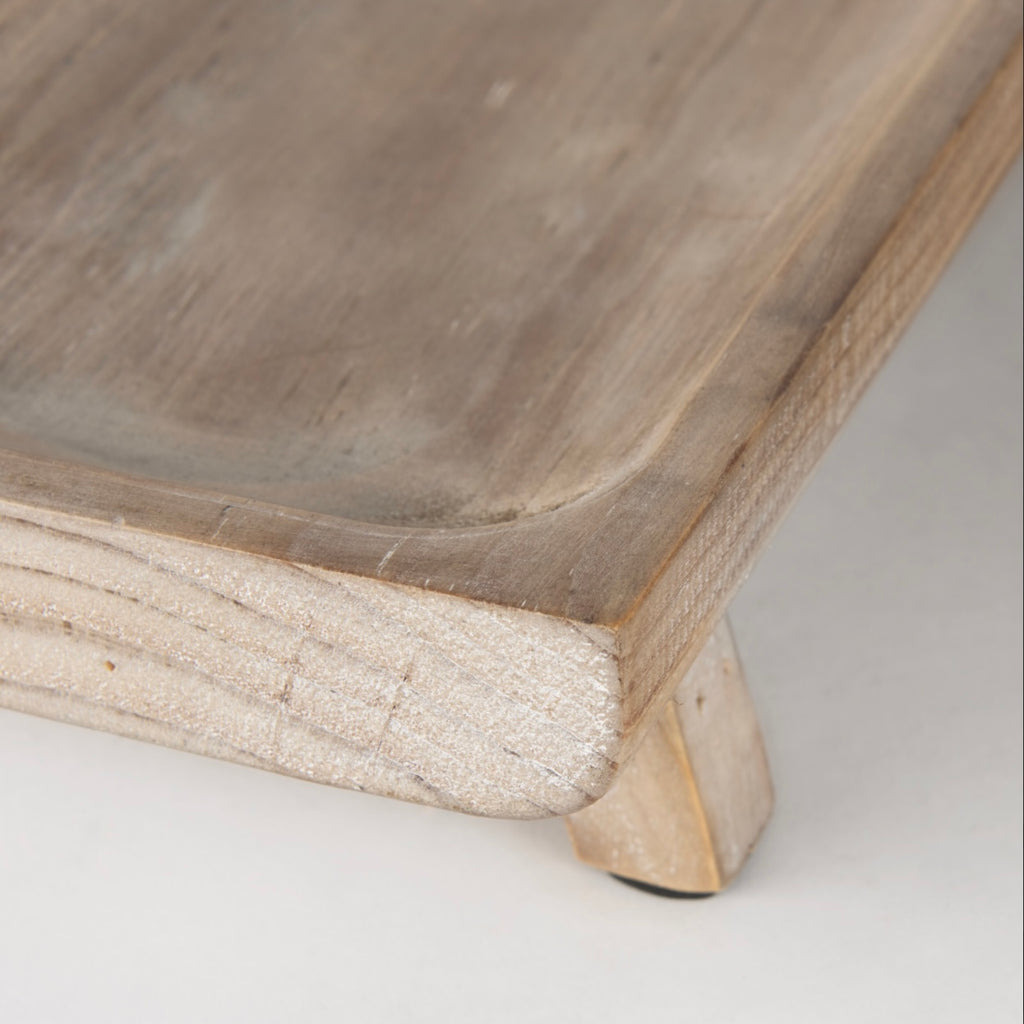 Charming in its simplicity, the Carver footed trays are made from solid wood that has been white-washed to show off the natural grain. The trays feature a lipped edge and are elevated with wood legs.