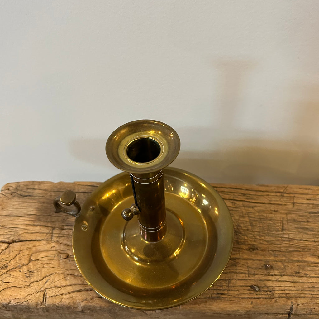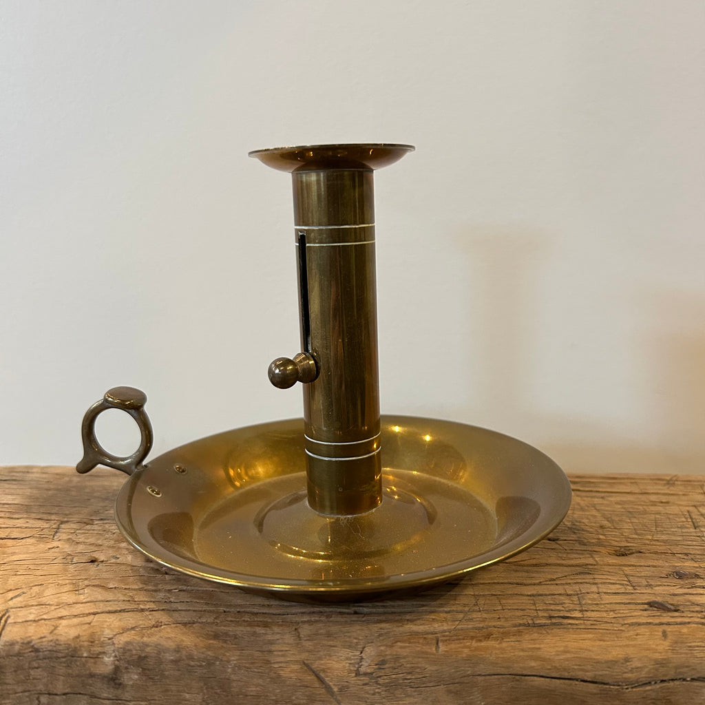 A good sized brass candle holder with a push up lever for easy candle removal. Simple engravings accentuate this striking piece.