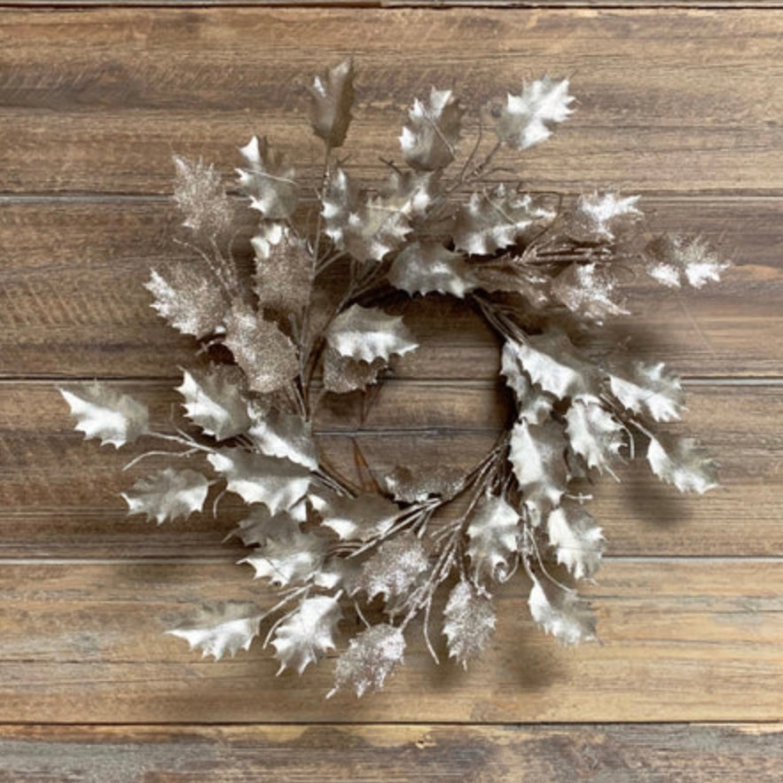 A metallic glittered champagne coloured holly leaf wreath to adorn your home.
