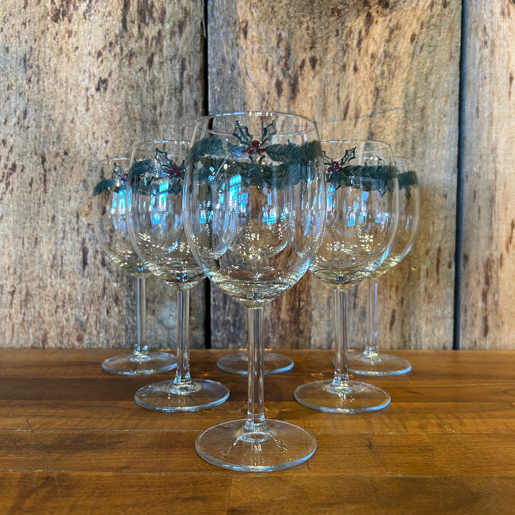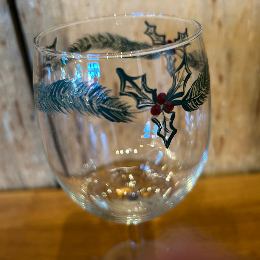 A fun set of wine glasses with a hand painted rim of holly.