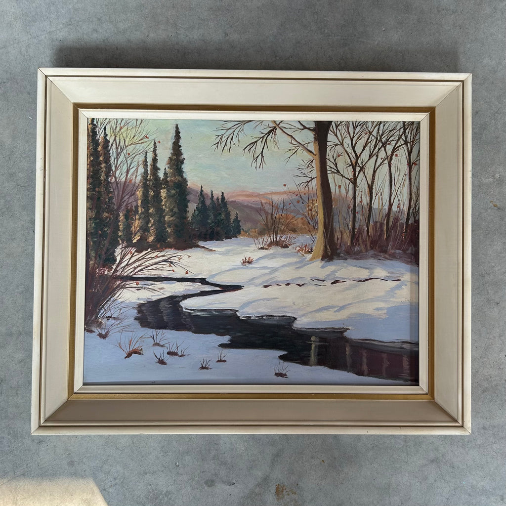 A pretty winter scene with grey blues, white and green. Very peaceful. Oil on board.