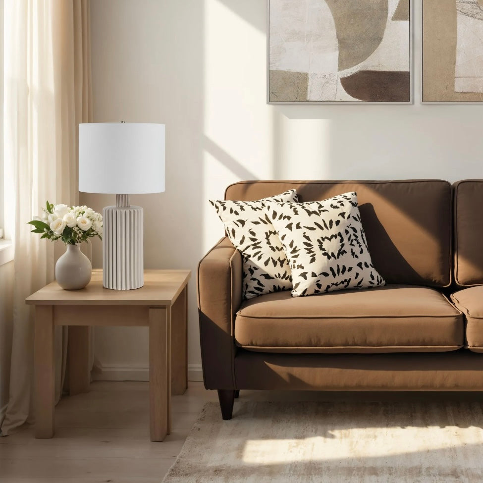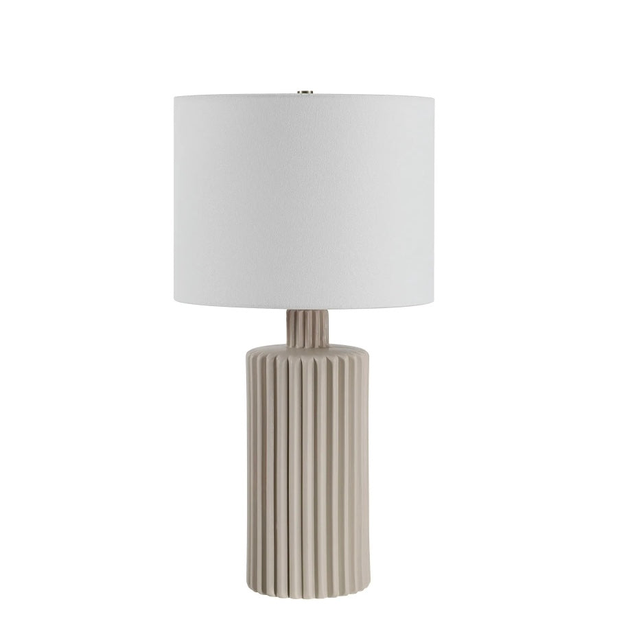 Update any interior with the texture and neutral hues of this ribbed ceramic table lamp. Measuring two feet tall, it holds a stately presence in a bedroom, living room or dining room. Offering dimmable lighting and a diffused glow thanks to its linen drum shade, this beige lamp will add style and light to your design project.