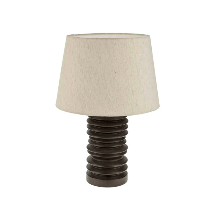 Crafted from solid mango wood, this lamp features an organic shape that highlights the natural grain and texture of the wood. Topped with a neutral linen shade, it emits a soft, ambient glow, making it a perfect addition to both bedrooms and living spaces.