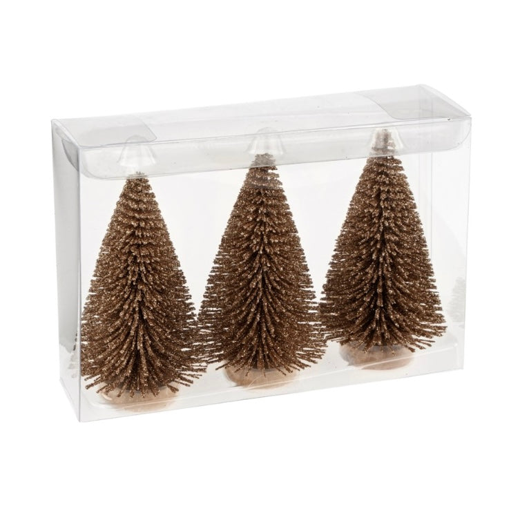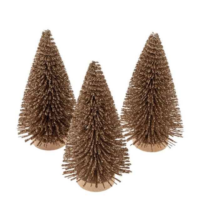 We pay homage to the classic tree motif and re-invent it with the mini gold bottle brush trees. High in sparkle and shine, they instantly create that holiday feeling. Packaged in a set of 3, we arrange them with other trees of varying heights to create a festive forest scene.
