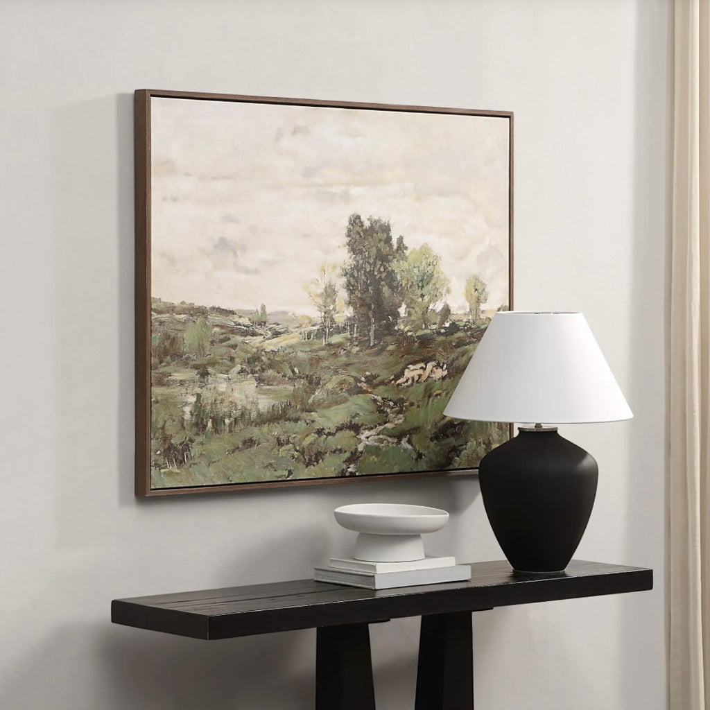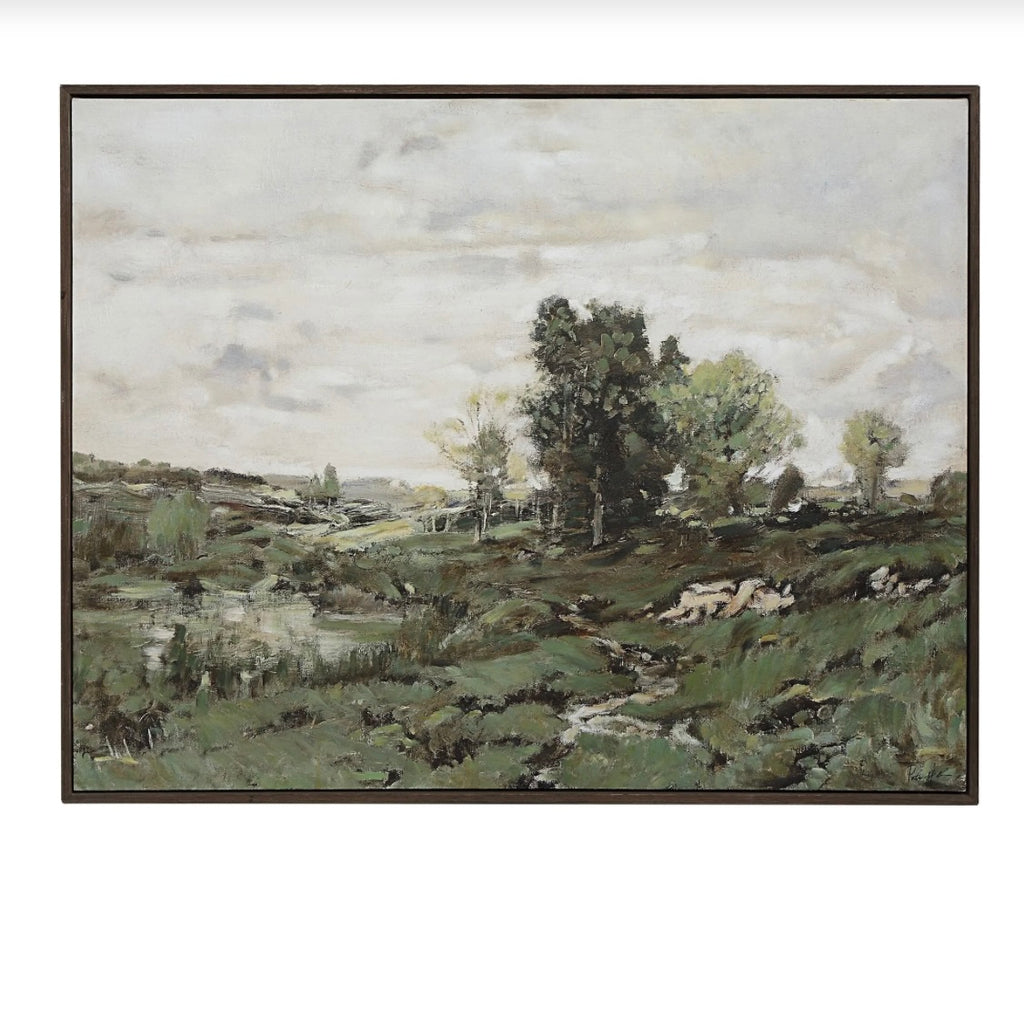 There’s nothing like beautiful landscape art to elevate a space with timeless charm. This oversized canvas features artfully applied hand-painted embellishments to deliver a one-of-a-kind look to any room. Bordered with a dark brown wood veneer frame, this painting is a great match for transitional interiors.