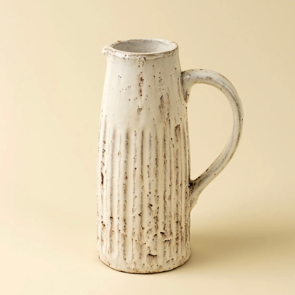Bring artisanal texture and timeless charm to your space with the Padme Decorative Pitcher. Crafted from terracotta and finished with a glossy cream glaze, this decorative vase showcases carved ridges and warm undertones that highlight the natural material beneath. Though not watertight, it’s perfect for dried florals or styled with a watertight insert if needed. The sculptural handle adds both character and styling versatility.