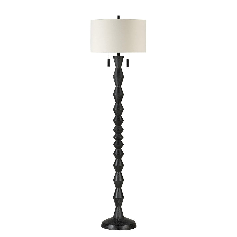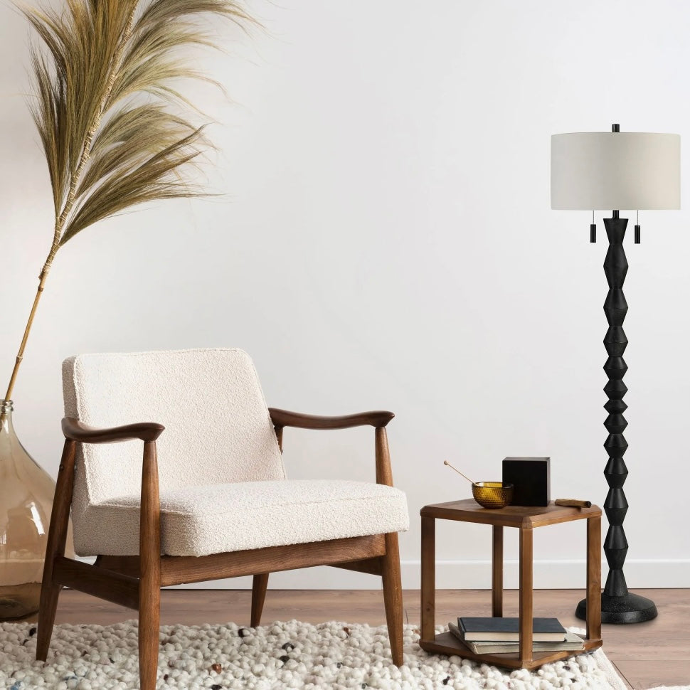 The Phyllis floor lamp takes a classic design and gives it a modern twist, bringing something new to any interior. Crafted with a bold geometric-inspired body and an eye-catching whitewashed black finish, it’s poised to hold a strong presence in any living room, dining room or office. This lamp is so good looking, even its pull chains have been given the designer look. Give one or both a tug and watch how the lamp’s ambient light filters through its cream linen drum shade to set the perfect vibe in any room.