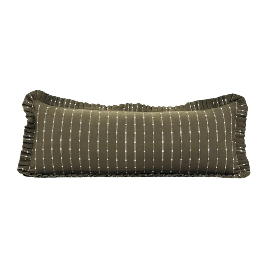 With it's charming olive and white stripes design it creates a timeless aesthetic that complements a variety of pillows. Our pillow collection features a unique ruffled edge along the trim, adding a touch of flair and elegance to each piece. With it's distinctive olive and white stripe it adds a pop of color and rich texture to your bedroom bedding. This bolster pillow cover is a versatile piece that can be easily mixed and matched with other decorative pillows. Ideal accent for your sofa, bed, reading nook, or any space in need of a refresh.