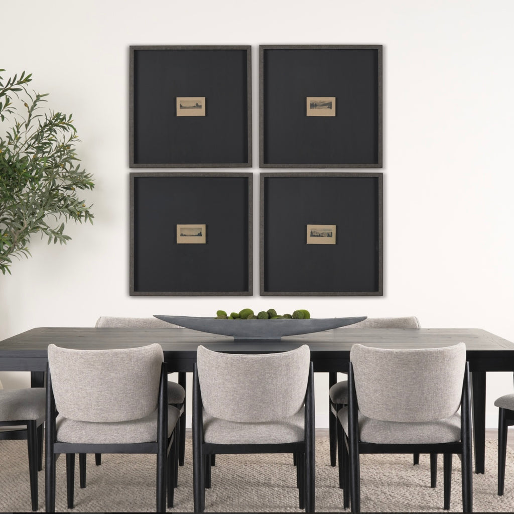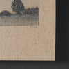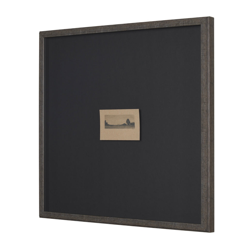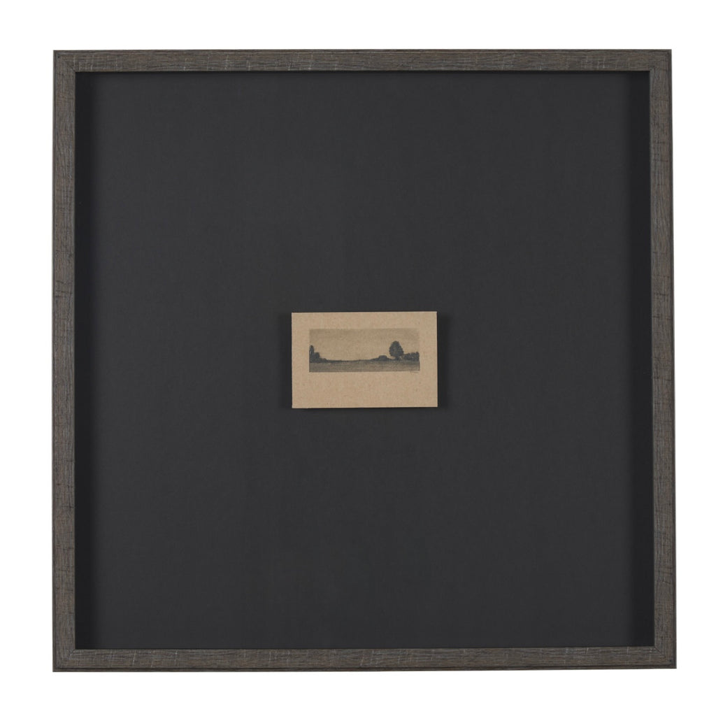 Shadows at dusk  is a framed drawing print on paper, matted under glass and enriched with hand-embellished textures. A delicate sepia-toned landscape sits at the center on a small inset card, evoking a quiet moment in nature. Set against an expansive black mat, it highlights negative space and intimacy. Finished in a dark wood-look frame, this piece blends minimalism with rustic charm—ideal for modern, transitional, or gallery-style interiors.