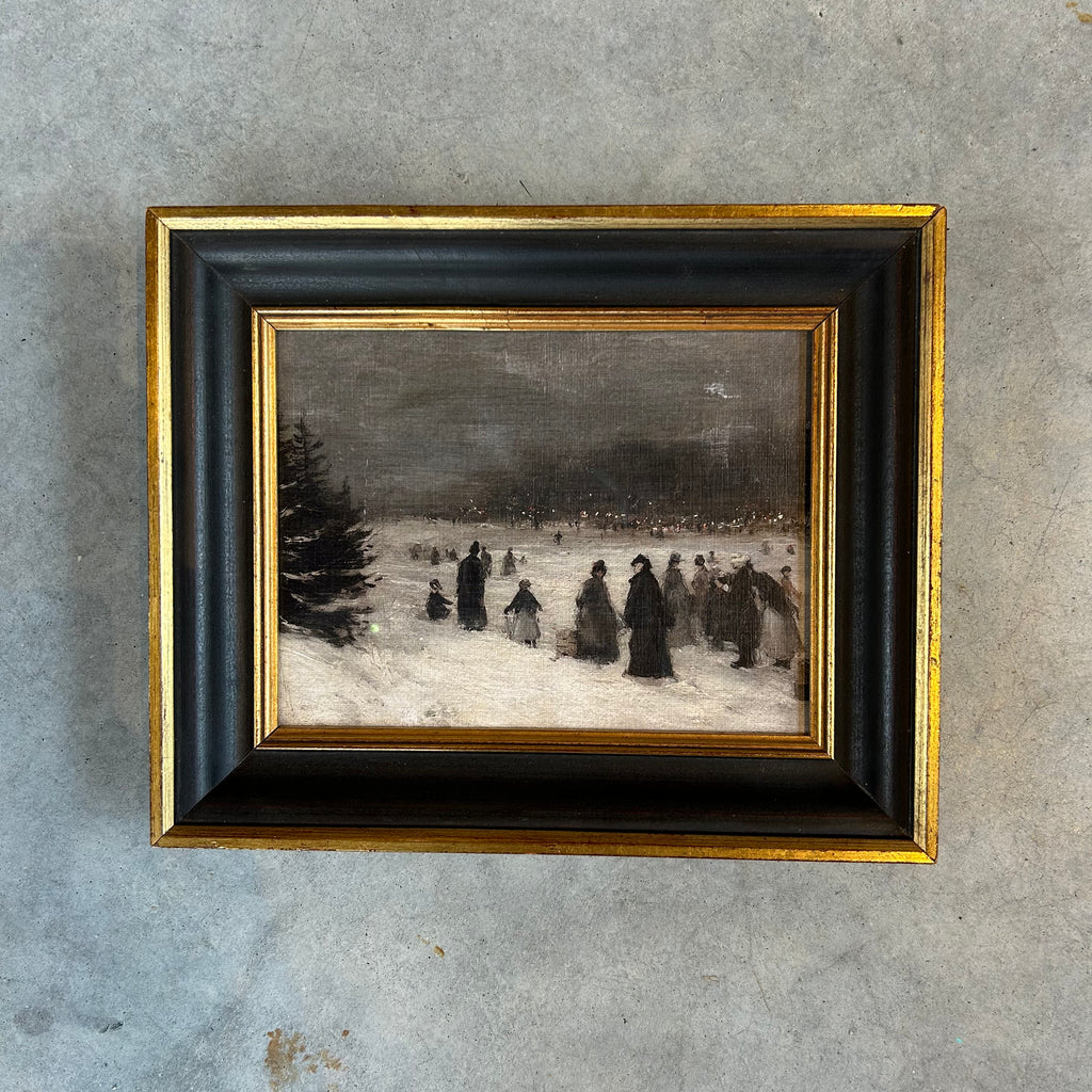 A beautiful village scene with people gathering at night.  Printed on linen paper and housed in a vintage wood frame with museum glass. Professionally framed.