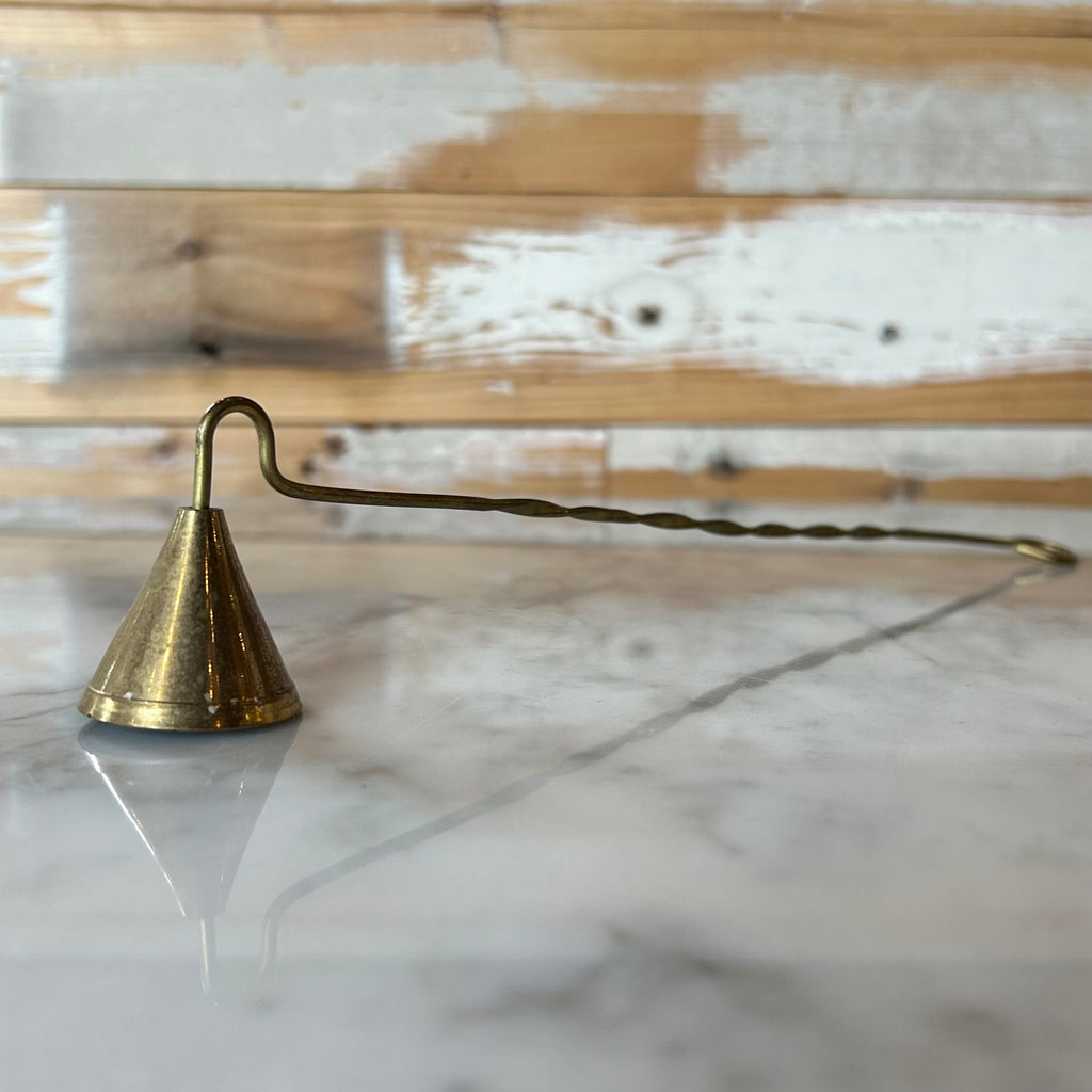 A pretty vintage candle snuffer with a gentle twit on the handle and a conical shaped cap.