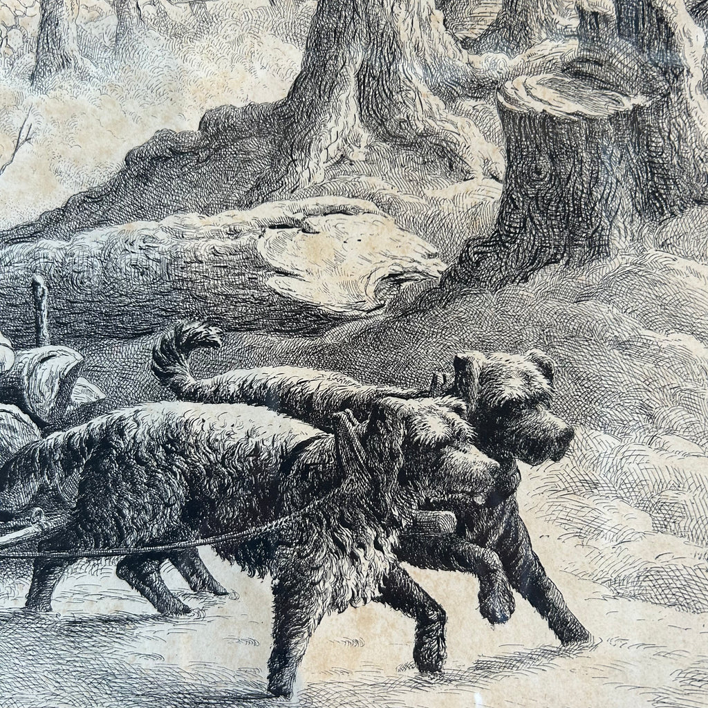 A beautiful etching of a dog sled in a winter forest. Professionally framed this is the perfect winter artwork for your home.