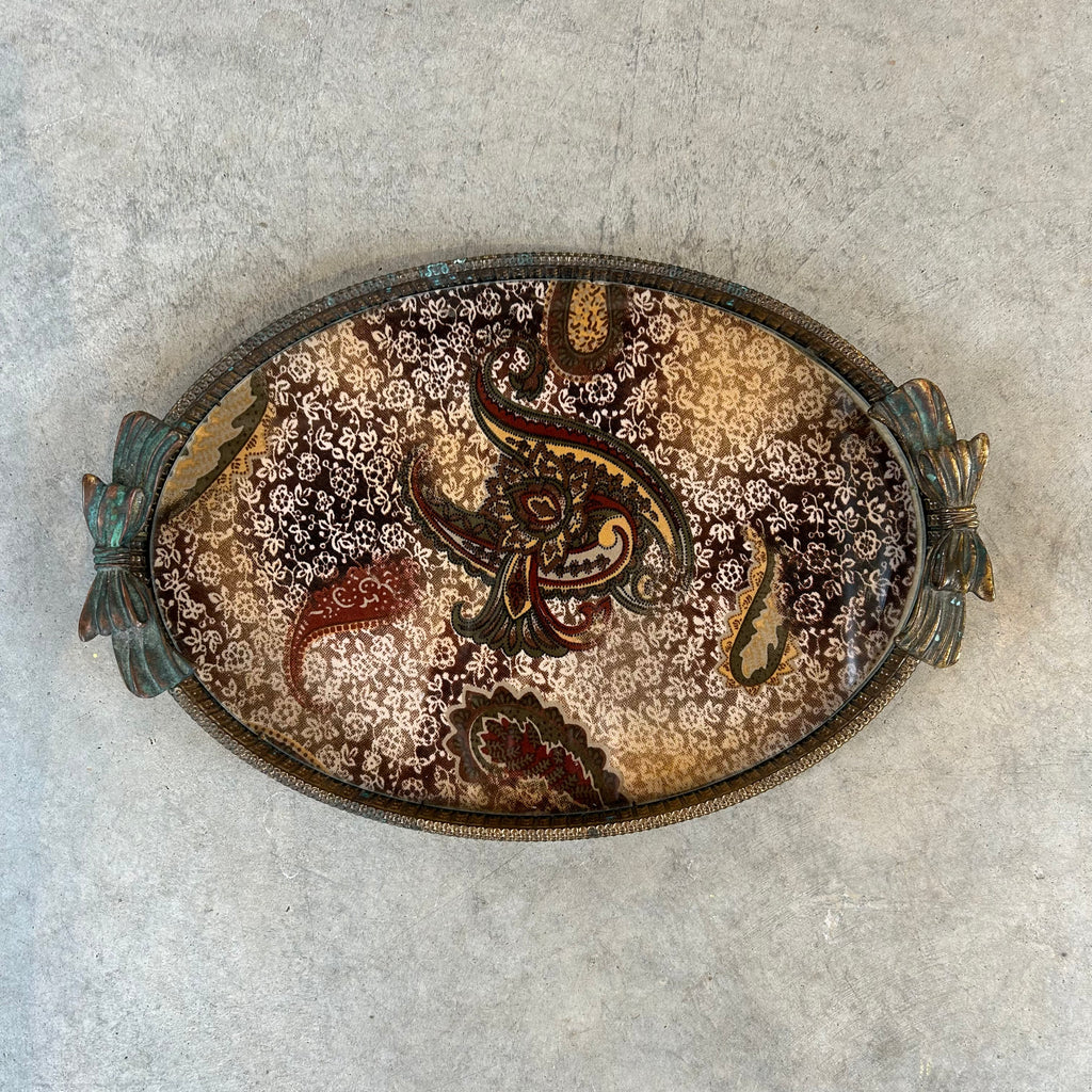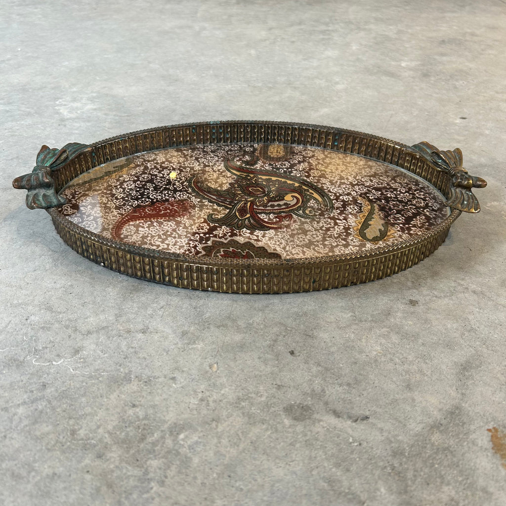 A pretty brass tray with a paisley fabric in browns, greens and burgundy with glass topper.  Beautiful details with bow handles and intricate brass surround.