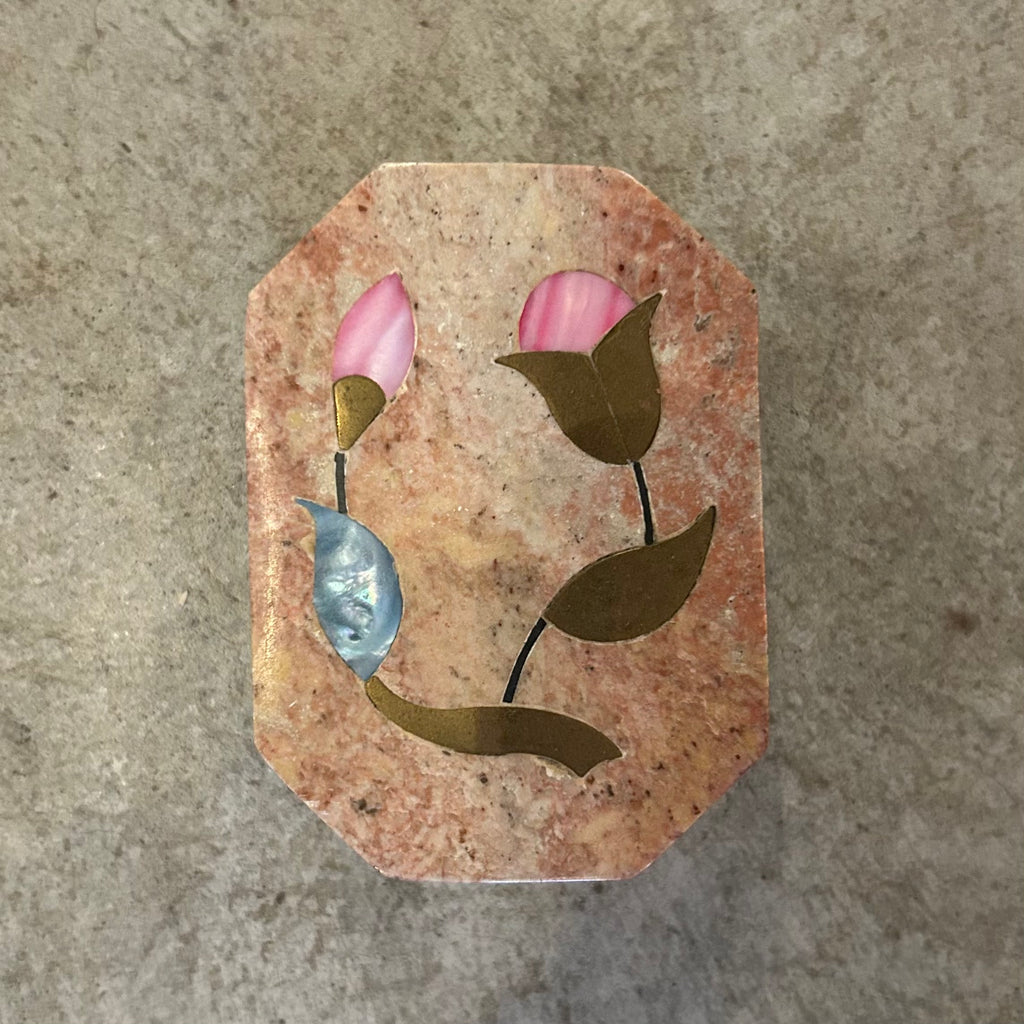 A pretty stone trinket box with a floral inlay.