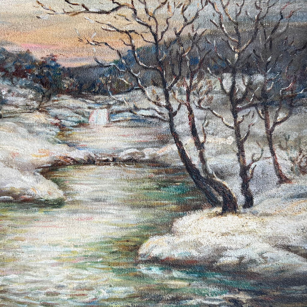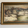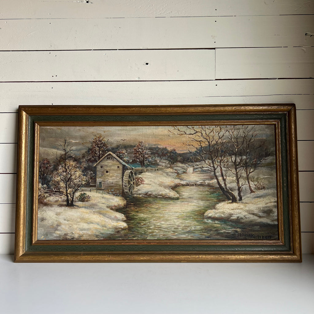 Beautiful winter scenery of a watermill in muted neutrals with hints of blue, red and green.