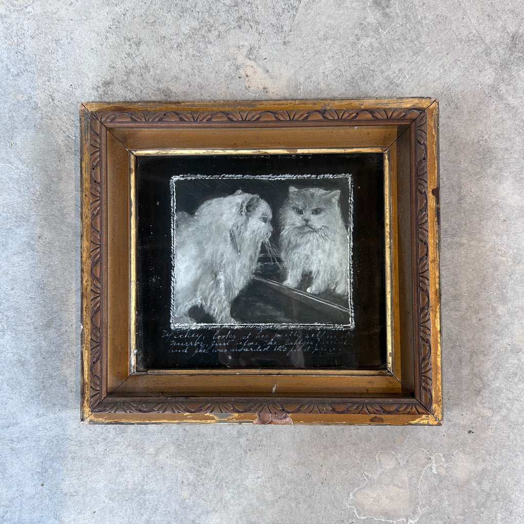 A great sketch of a cat with white pencil on black paper. There is a little verse written as well. All of this charm is housed in an antique wood frame. So fun and truly one of a kind!