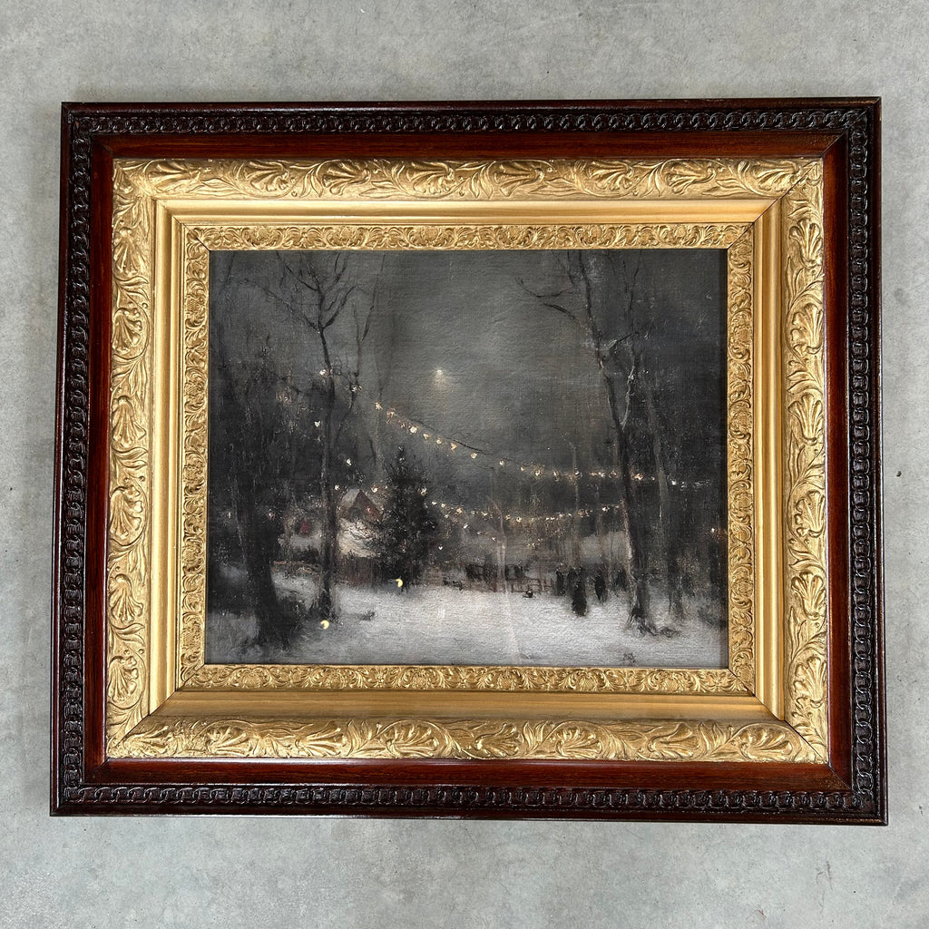 A beautiful image of a village with lights on a winter evening printed on linen paper and housed in a fantastic antique ornate wood frame.
