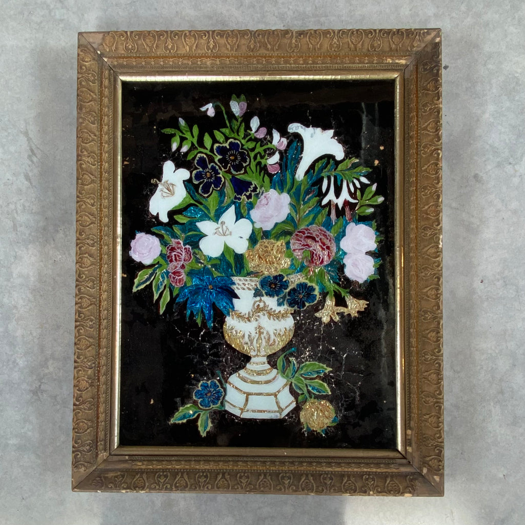 A fantastic reverse glass painting housed in an antique gilt wood frame. Clean white with golds, and greens on a black background. A great focal point and conversation piece.