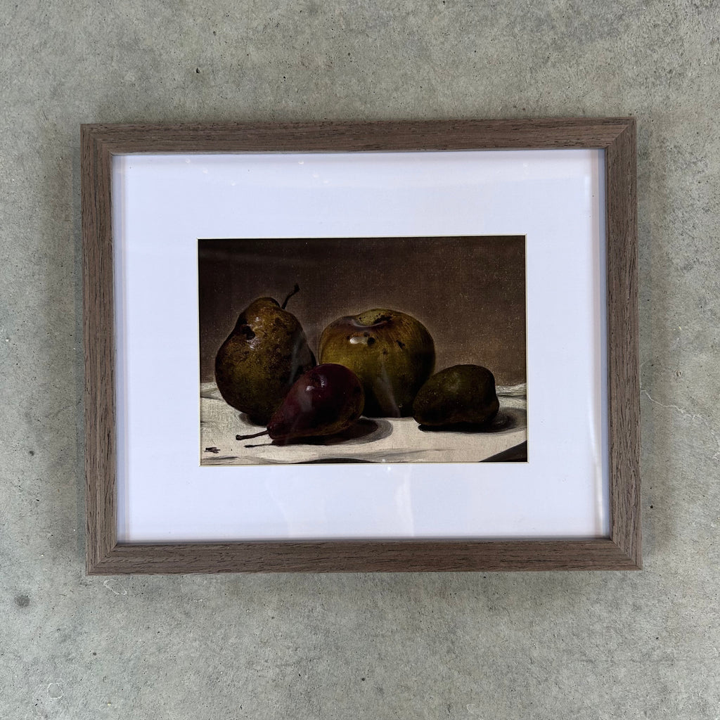 A beautifully reproduced art print on linen paper of a vintage still life painting housed in a simple wood frame and white matting. The colours are rich greens with aubergine and white.