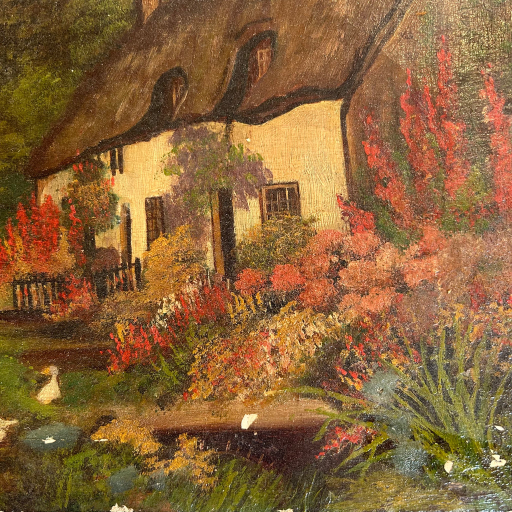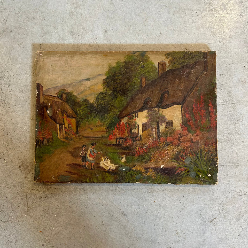 A charming cottage scene with children feeding ducks. Wonderful warm colouring on this canvas painting.