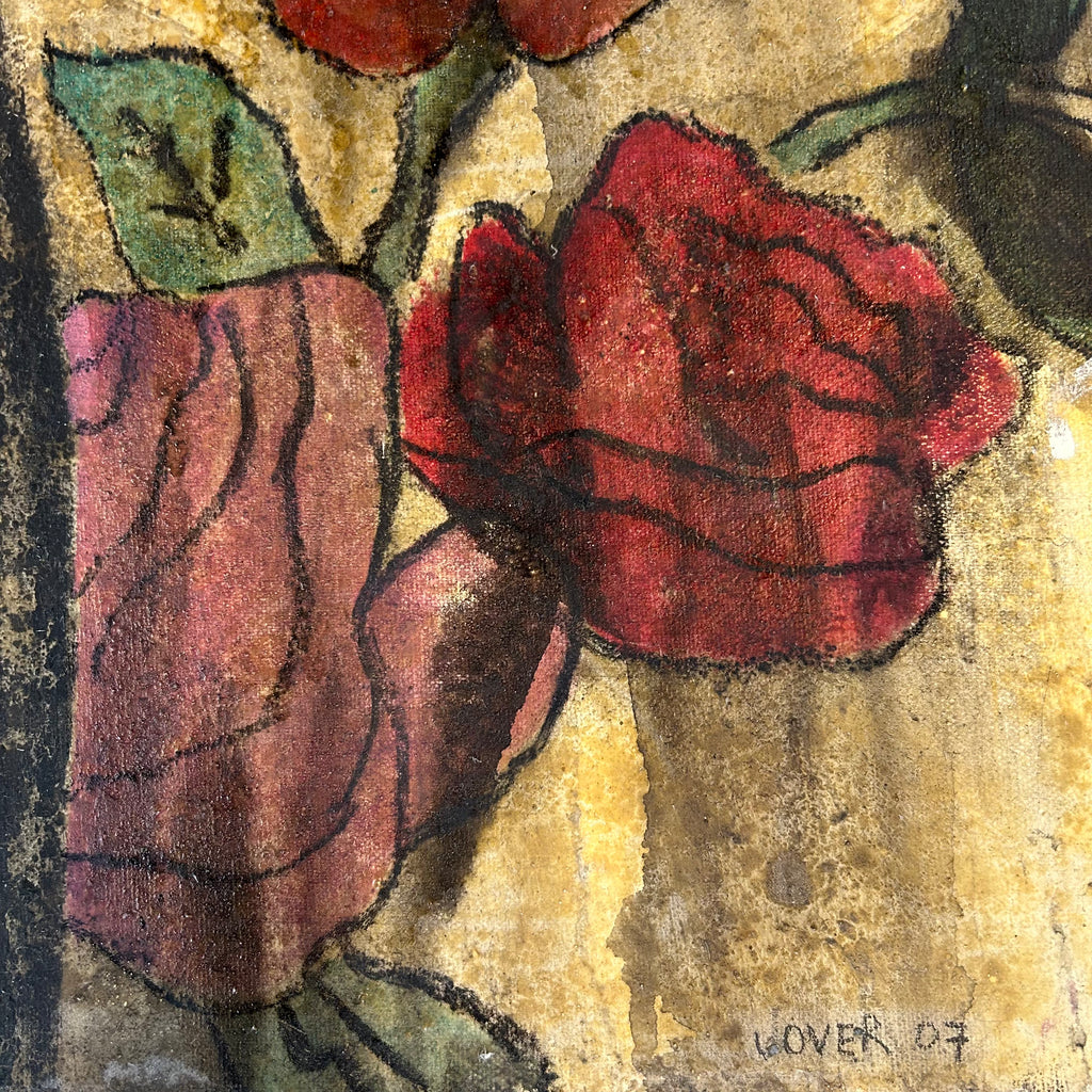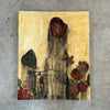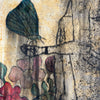 A beautiful mixed media painting on canvas of a woman in amongst flowers and butterflies.  A pale yellow background with deep pinks and blue with a charcoal wash this is a very captivating artwork.