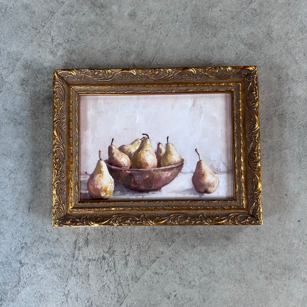 This beautiful vintage-inspired print of pears in an earthenware bowl features an intricately crafted frame and finished with a bronzed patina, adding depth and character to your space. This art piece is printed on a high-quality canvas with a soft velvet backing and a jagged gold hanger.