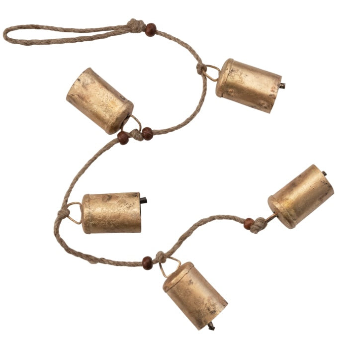 28”L Hanging antique metal bells on jute rope. Gorgeous to hang over the side of a mantel, laying on your tablescape or simply, hanging on the wall.
