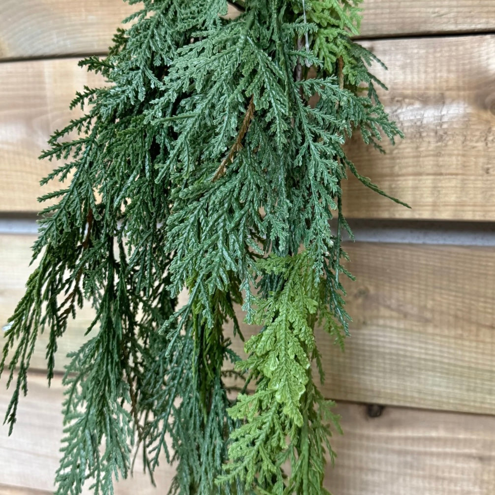 Fresh touch northern white cedar hanging bush. Nice drape to add to any pot.