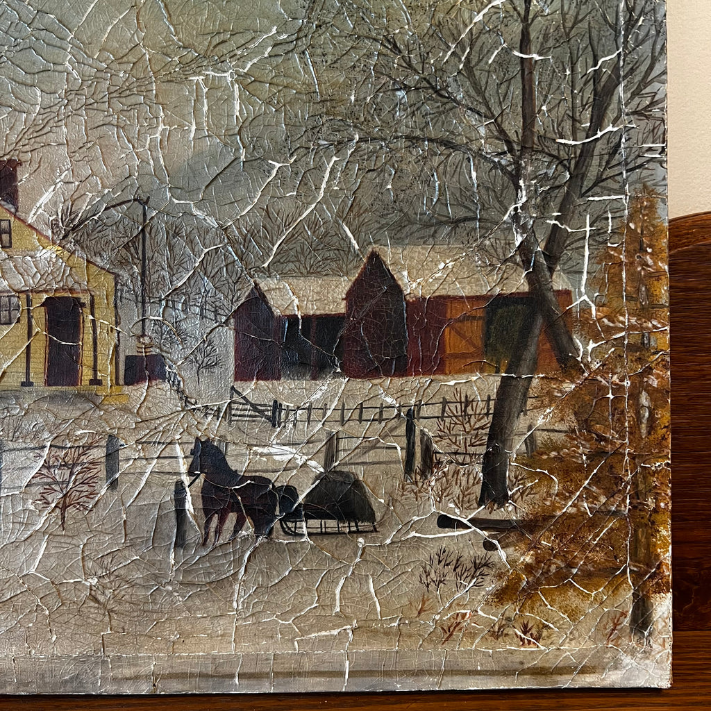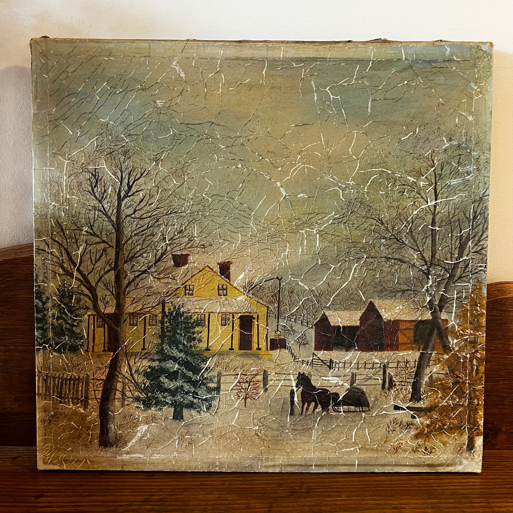 Oil painting on canvas of a rural homestead and barns set in winter with split rail fence and a horse and cutter tethered in the front.  Very charming scene.  Has heavy craquelure but somehow it almost adds to the wonderfulness of this painting.