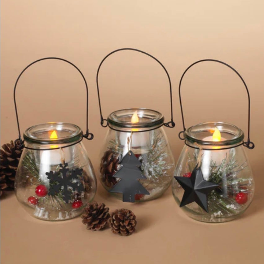 These charming holiday glass lanterns with a tealight holder are great to pop anywhere to add to some festive light.