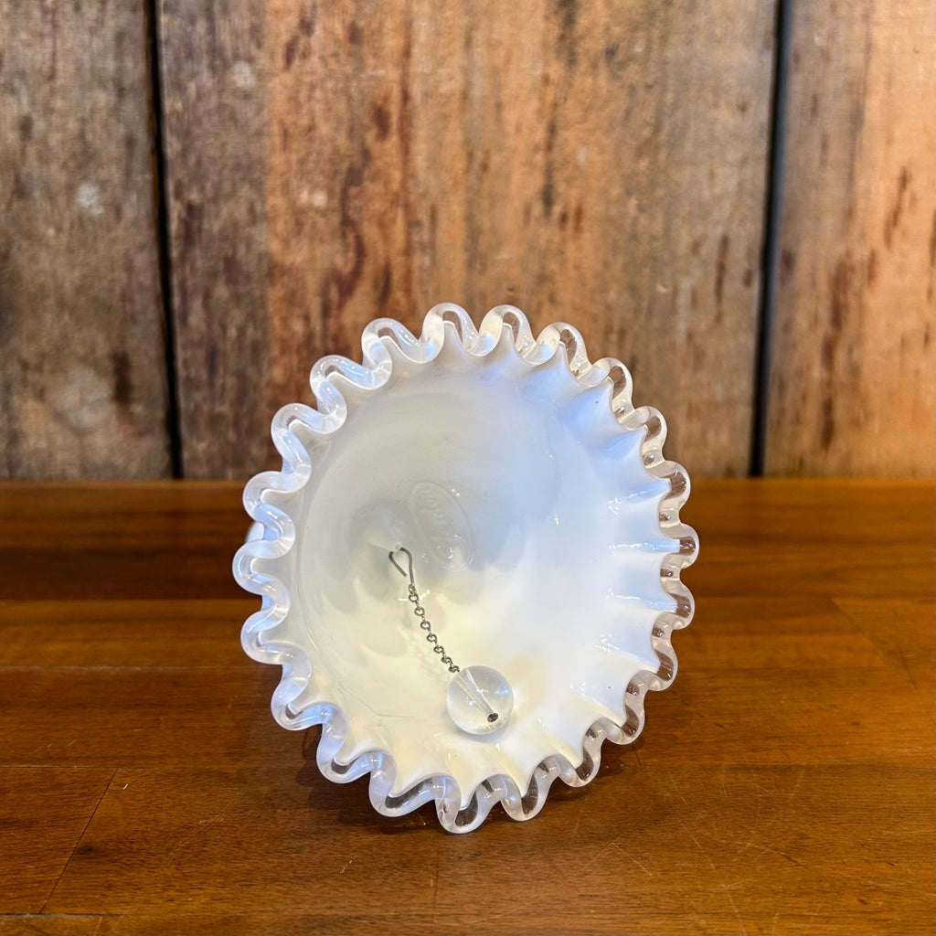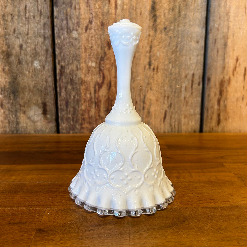 So pretty! A milk glass bell with clear glass on the scalloped rim and a lacey pattern throughout.