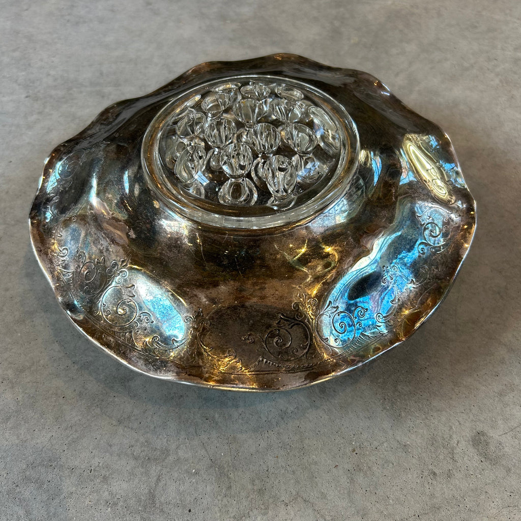 A pretty silver plated flower frog bowl with an etched rim.  Lovely as a centrepiece.