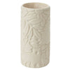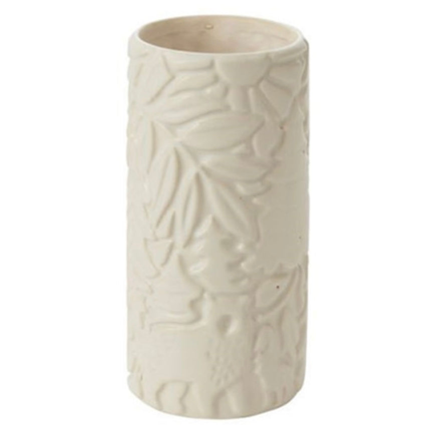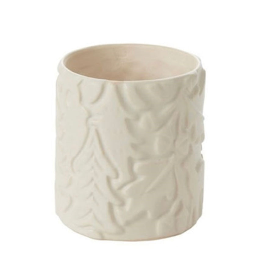 This is a charming clay vase with a white eggshell glaze and a woodland scene.