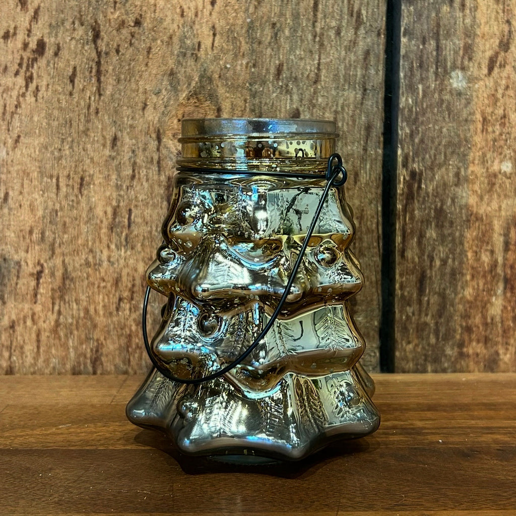 Pretty glass jar with a gold mercury look exterior to hold your tea lights.  Wonderful for your holiday table and displays.