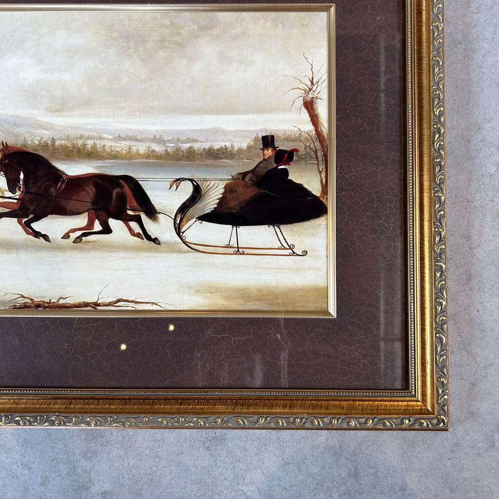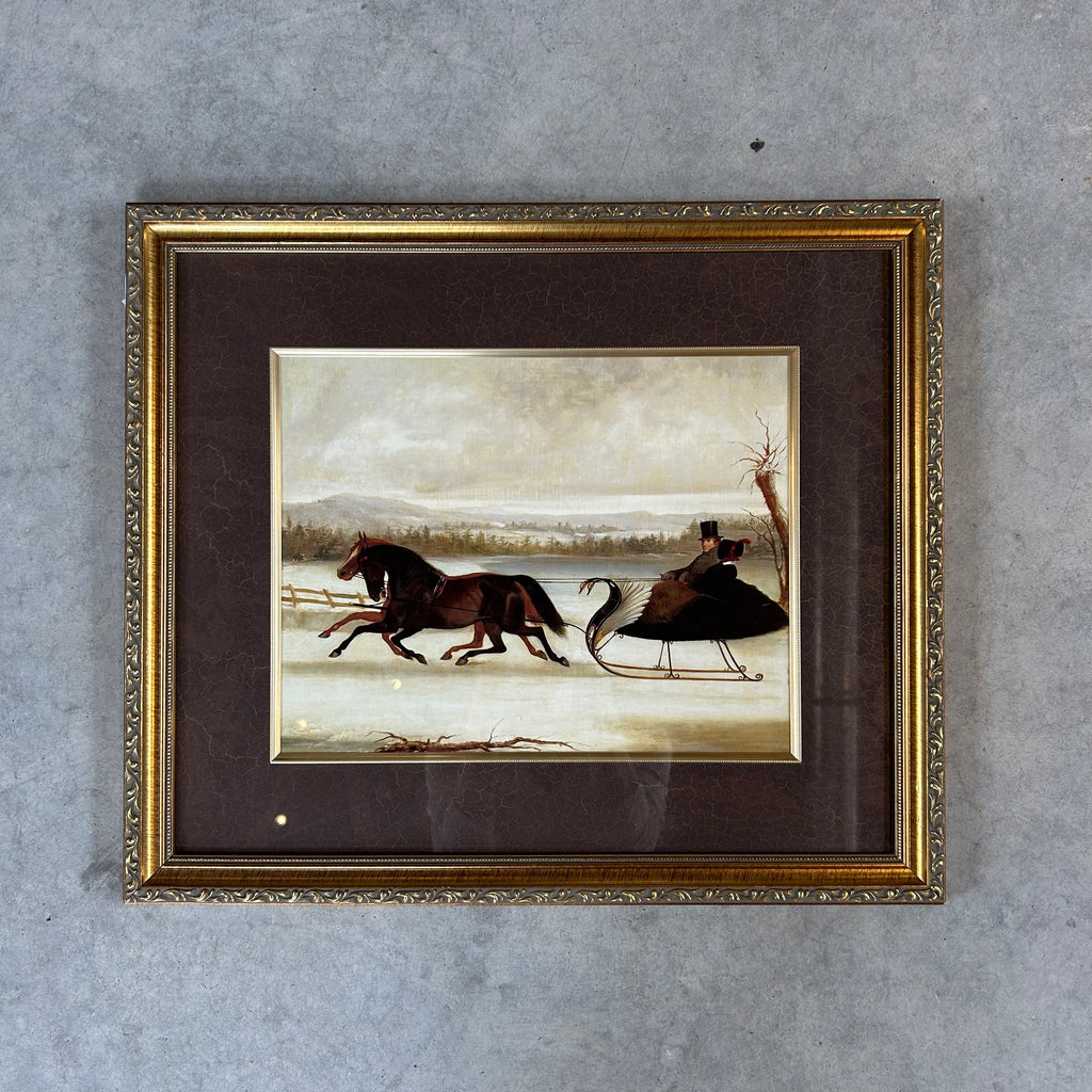 A wonderful framed print of an old painting, likely early 1800’s, of a woman and gentleman on a sleigh. The colours are fantastic! And the sleigh! We love the swan embellishments.