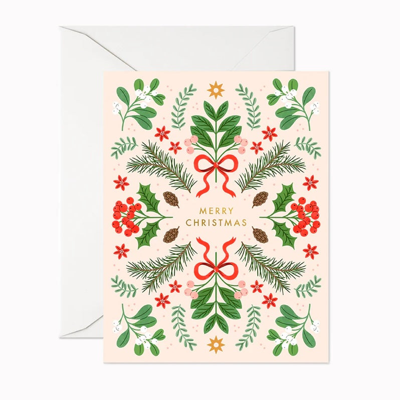 A symmetrical design of winter berries, with a touch of gold foil lettering, to wish someone Merry Christmas.