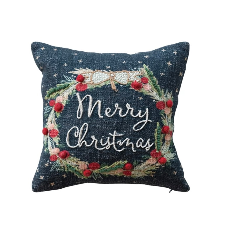 This square cotton printed pillow is a celebration of holiday warmth and charm. The front boasts a "Merry Christmas" message encircled by a wreath, beautifully detailed with embroidery, beads, and pom poms. The multicolored design on a cotton cover, paired with a plush polyester fill, makes it not only a visually appealing addition to the decor but also a comfortable one. Measures 12 in width and 12 in height, making it an ideal size for a decorative holiday accent on any piece of furniture. It's the perfect size to add a touch of festive elegance to a couch, chair, or bed, inviting everyone to embrace the joy of the season