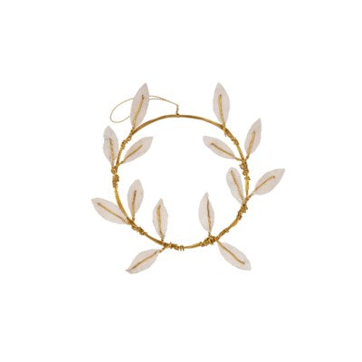 The Olive Wreath Canvas Ornaments are made from upcycled army tents and hand stitched and decorated with copper, brass, and iron wire embroidery.