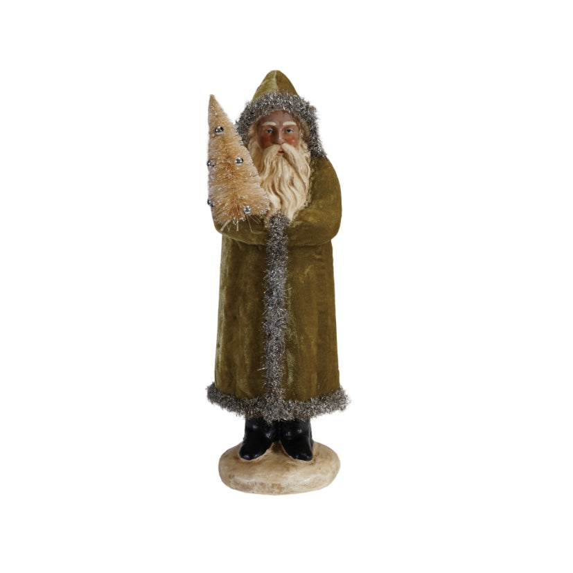 A beautiful old world Santa made from paper mache with a velvet coat and bottle brush tree.  A wonderful part of your holiday display.