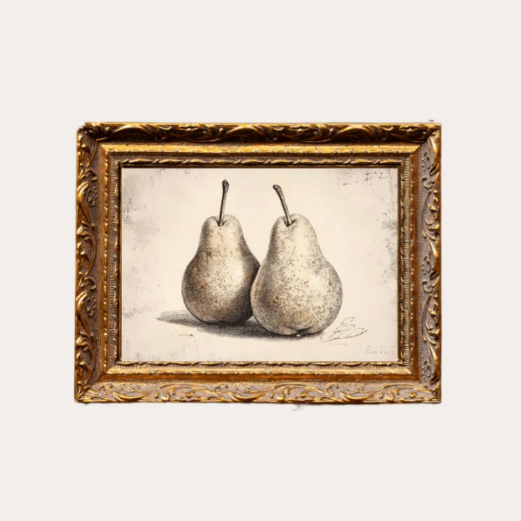 Our Pear Sketch framed art showcases a delicate sketch of fresh pears.