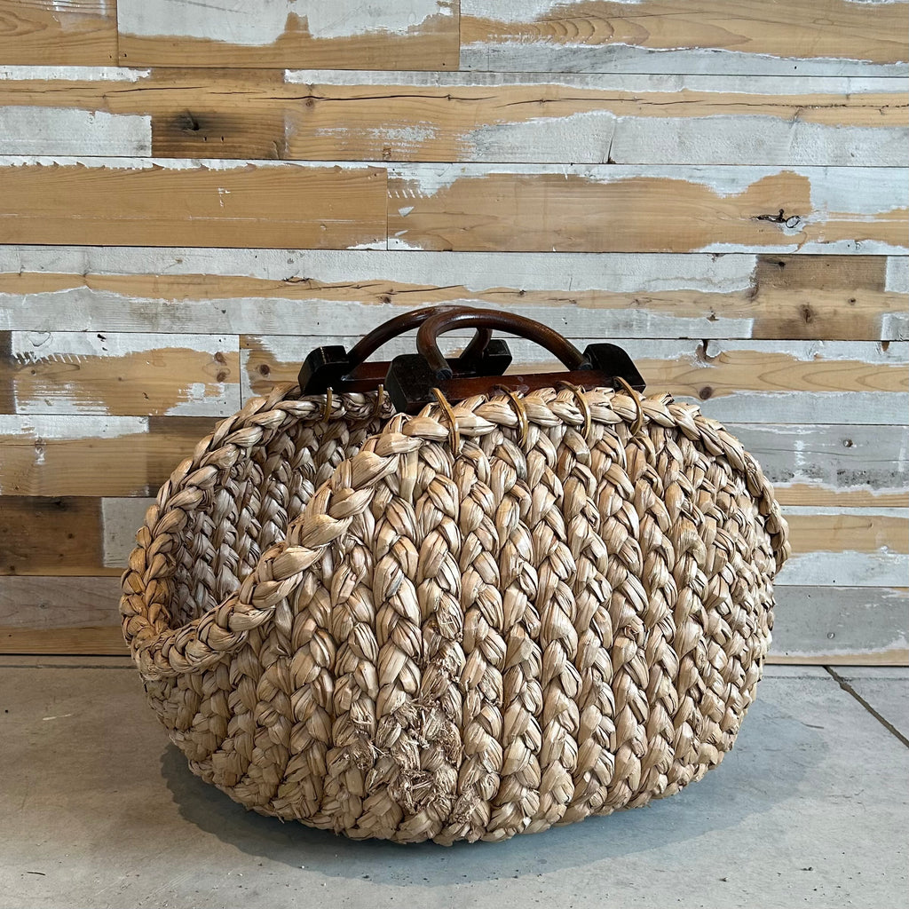 This is a great hand woven seagrass basket with wood handles. Great for all kinds of storage, wood, laundry, pillows, you name it.