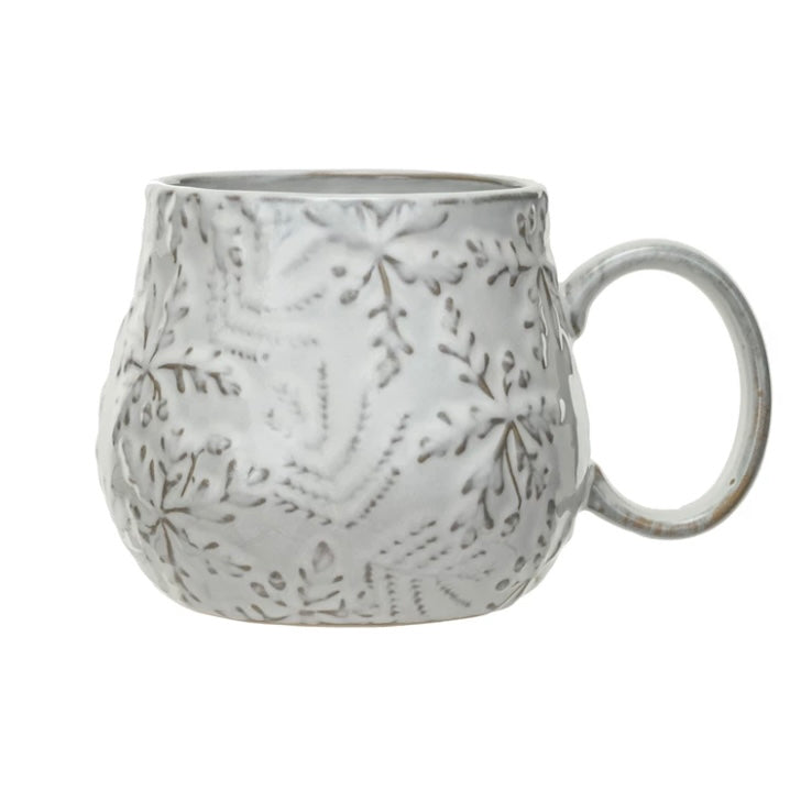 This embossed stoneware mug captures the essence of winter with its snowflake design and reactive glaze that ensures no two are exactly alike. The white color accentuates the embossed details, making it a standout piece. With a comfortable size of 4.5" round by 3.75"H and a 16 oz. capacity, it's perfect for those who appreciate a substantial cup of coffee or tea. The reactive glaze not only adds beauty but also makes each mug unique.
